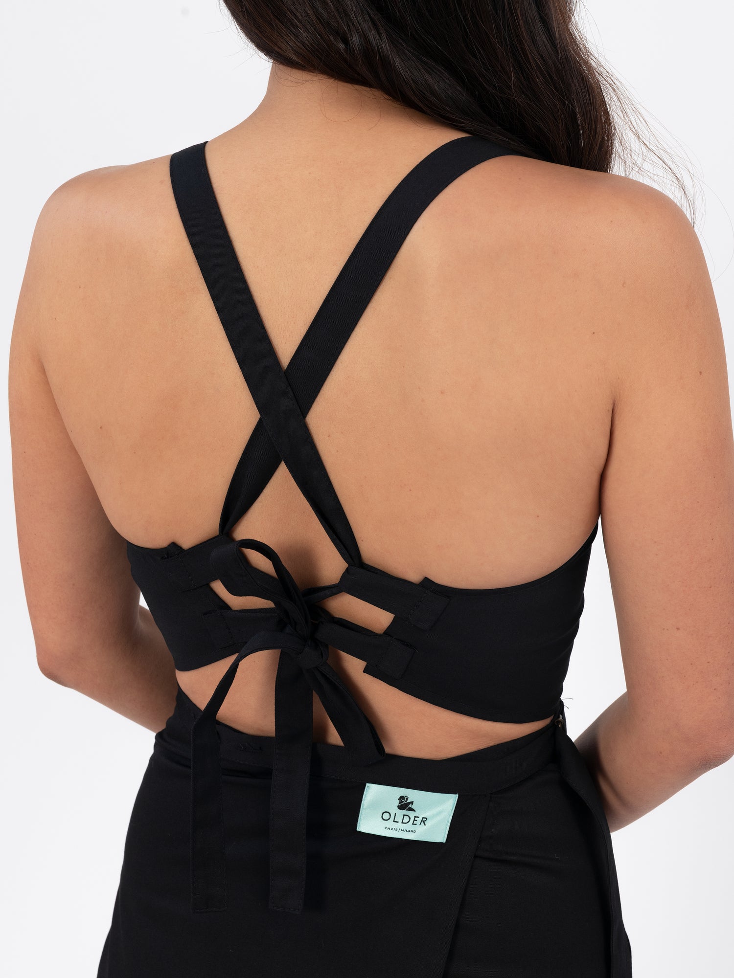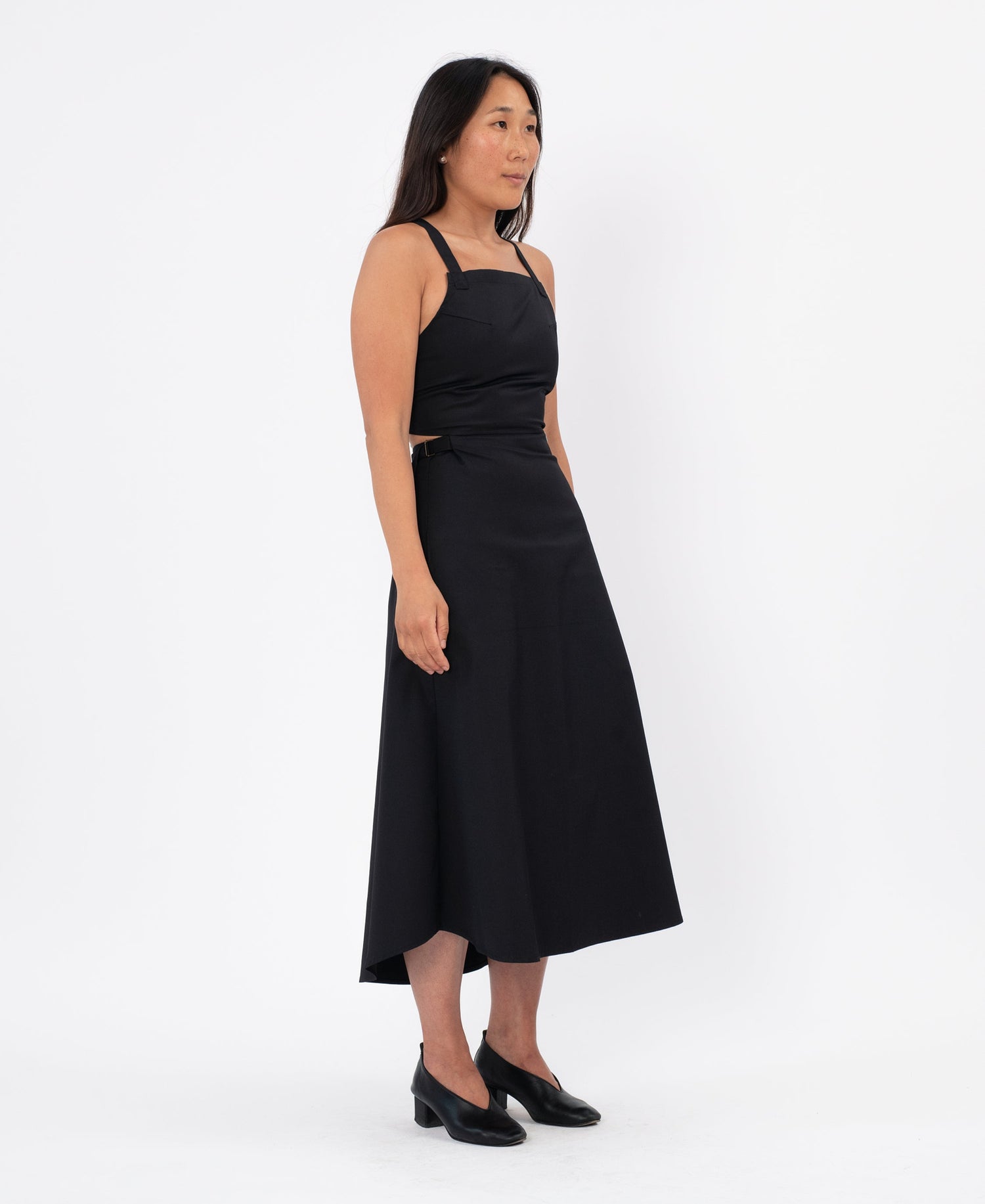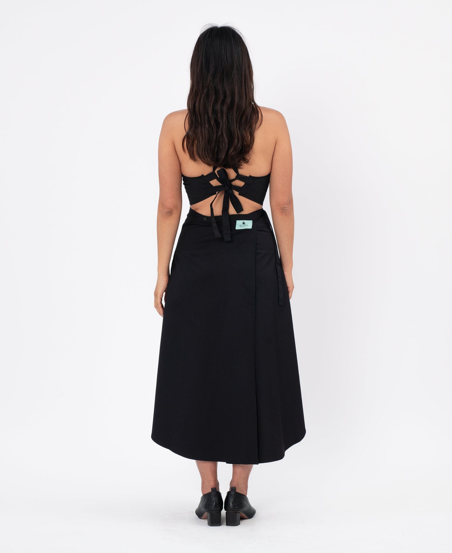 Mid-calf length, one piece, adjustable wrap skirt and crossed back top.
