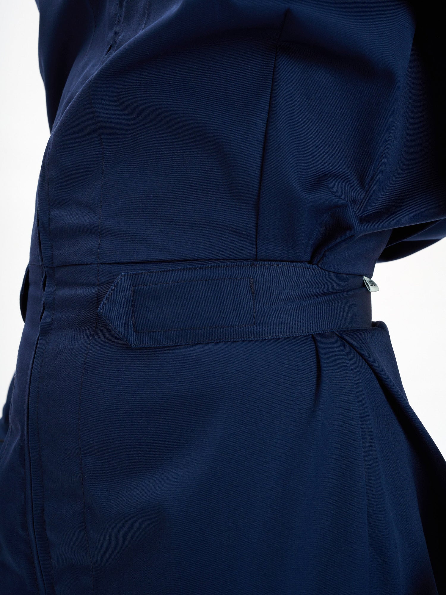 the style features a round collar and velcro straps at the waist and at the wrists for fastenings.