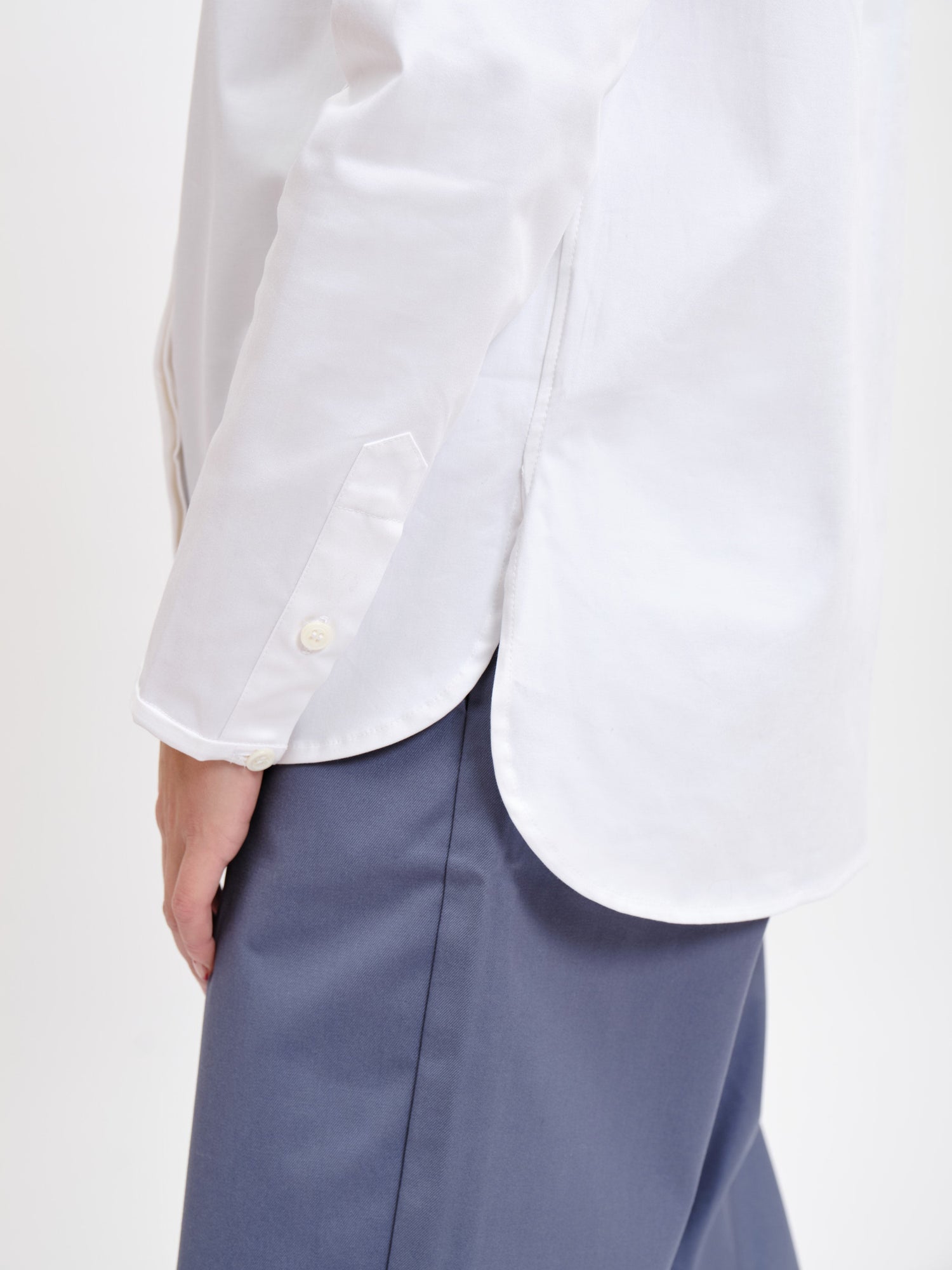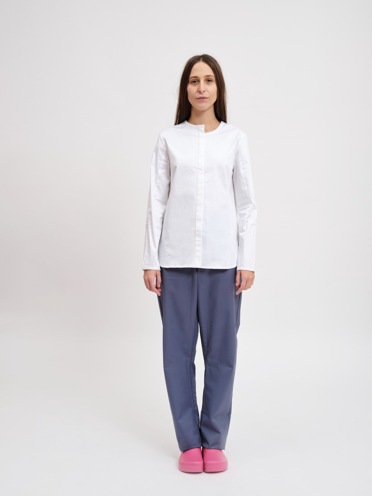 Hidden button-stand in the centre front, slits at the sides around the bottom hem.